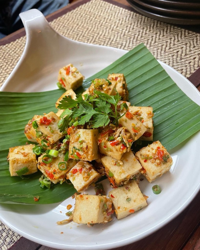 Among the array of dishes we enjoyed, one that stood out was the Stir-Fried Tofu with Chili and Herbs. This dish featured cubed tofu stir-fried to perfection, infused with fresh chilies, herbs, and spices. The tofu was beautifully presented on a banana leaf, garnished with chopped scallions and fresh cilantro, adding a pop of color and freshness to the dish. The combination of flavors was outstanding, with the mild tofu perfectly complemented by a hint of spice from the chilies.