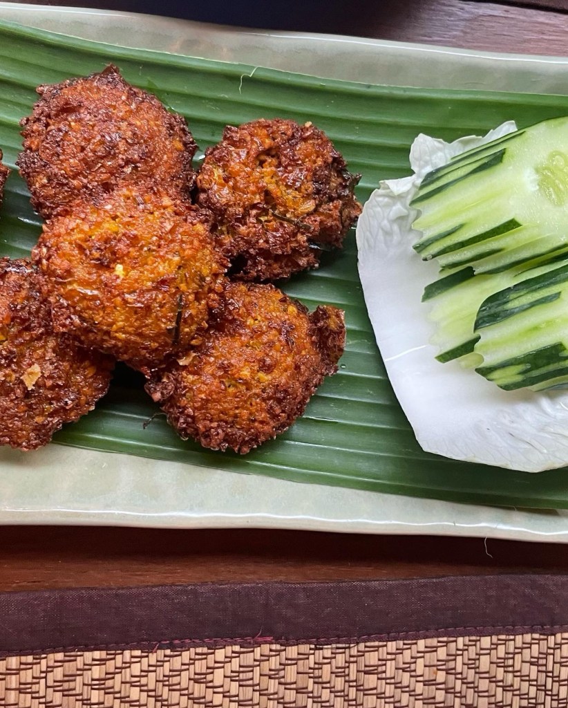 Next up, we savored the Spicy Herb Falafel. These deep-fried chickpea balls were seasoned with a mix of local herbs and spices, creating a crispy exterior with a soft interior. Served on a banana leaf with sides of cucumber, cabbage, and green beans, these falafels were decent.
