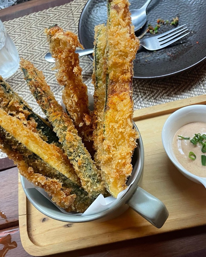 We also tried the Crispy Zucchini Sticks, a unique and interesting dish. These zucchini sticks were coated in a light, crispy batter and deep-fried, served with a tangy dipping sauce. Although flavorful but they were a bit over fried and heavy on the stomach.