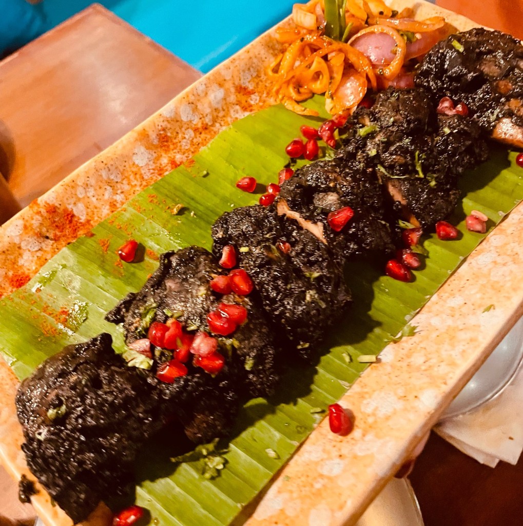 For starters, we also had the Kala Sha Kala Kukkad, a unique take on chicken tikka. This dish is marinated in a dark, almost blackened spice mix that gives it a distinctive flavor. The origin of this dish lies in the traditional Punjabi kitchens where blackened spices are used to impart a smoky, robust flavor to the meat.